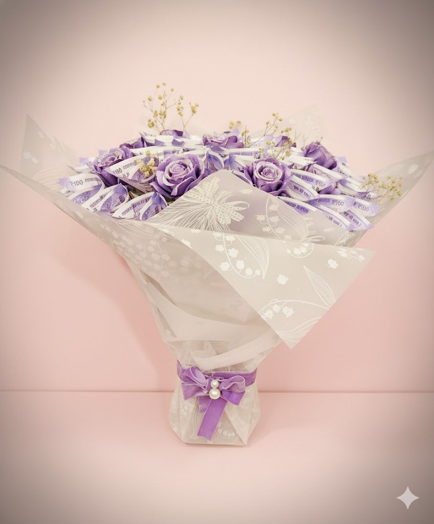 Delight in the grandeur of the Aroma Luxe Blessings Bouquet by Sparsh, an artful presentation of prosperity and elegance. Each bouquet is crafted with fragrant blooms, luxurious notes of floral scents, and a dash of sparkle to elevate your gifting experience. This bouquet isn’t just a currency arrangement; it's a cherished keepsake that blends tradition with opulence, perfect for auspicious occasions.
