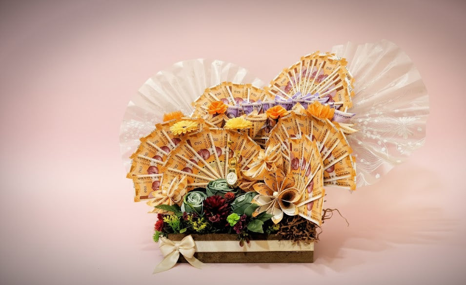 This luxurious Currency Bulky Shagun Bouquet by Sparsh is an exquisite blend of tradition and elegance. Adorned with vibrant floral elements and a touch of sparkle, it makes an unforgettable gifting choice for any occasion. Scented with a delicate fragrance that enhances its charm, this bouquet is designed to stand out and symbolize prosperity. Perfect for weddings, festivals, and celebrations, it combines the beauty of floral arrangements with the auspiciousness of currency, wrapped in a decorative style that’s both visually and aromatically delightful.